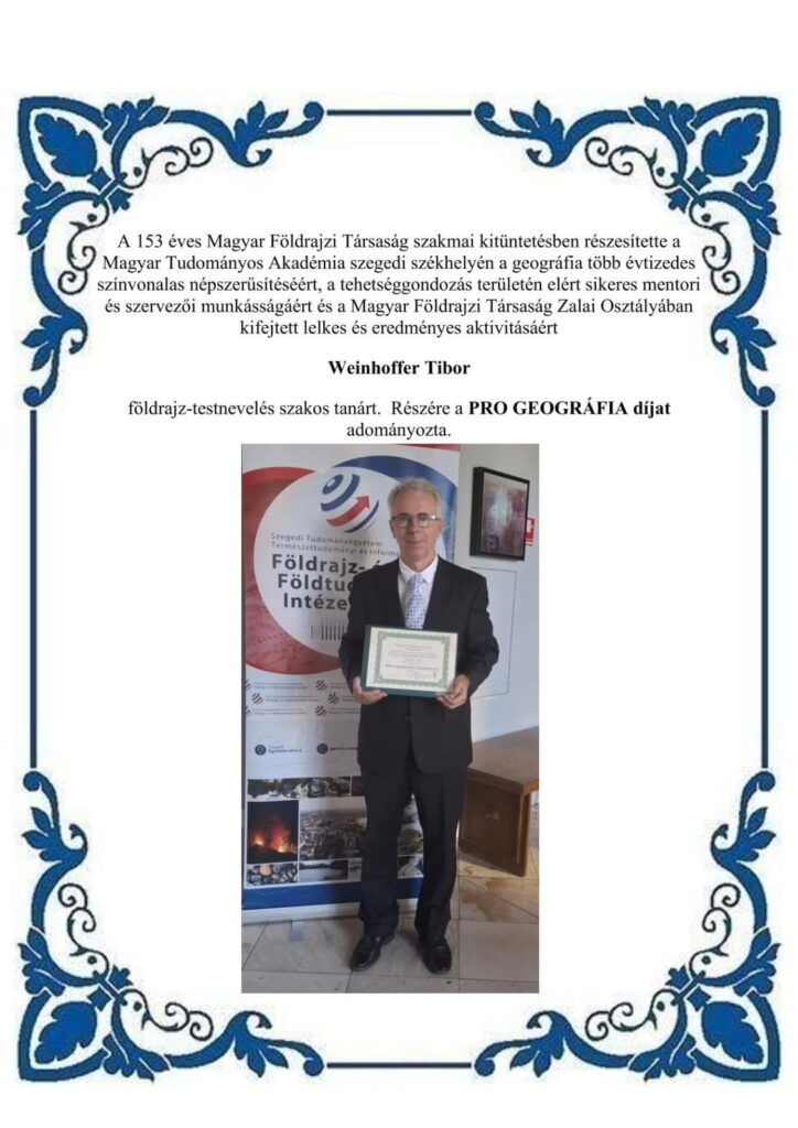 2024-ben kiváló pedagógiai munkájáért a Zalaegerszegi Tankerületi Központ igazgatójától Pedagógiai Nívódíjat kapott.